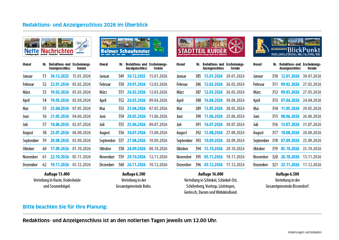 Wir geben monatlich die vier kostenlosen Nachrichten- und Anzeigenblätter „Nette Nachrichten“, „Stadtteil Kurier“, „Belmer Schaufenster“ und „Bissendorfer Blickpunkt“ heraus. Damit erreichen ihre Anzeigen und Nachrichten mehr als 40.000 Haushalte in Stadt und Land Osnabrück. So bieten wir Unternehmen eine attraktive Möglichkeit, ihre Anzeigen zu veröffentlichen oder Beilagen zu verteilen. Für Sportvereine, Kulturvereine, Heimatvereine, Feuerwehren und öffentliche Einrichtungen sind unsere Hefte eine ideale Möglichkeit, ihre Presseberichte und Veranstaltungshinweise einer breiten Öffentlichkeit zugänglich zu machen.